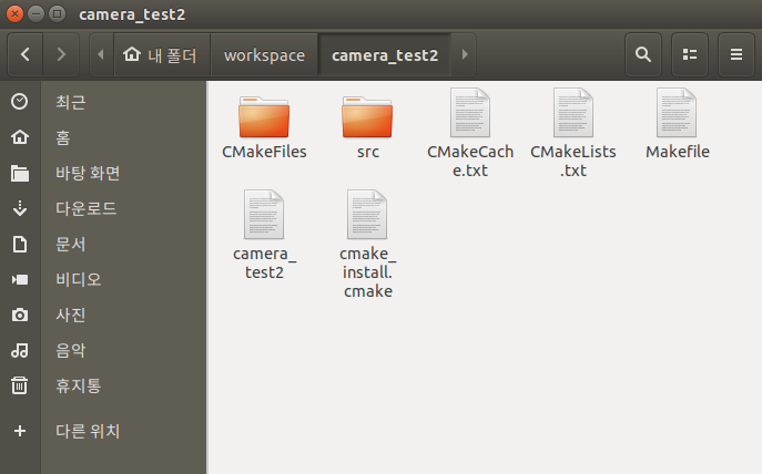 cmake를 완료하고 camera_test2 디렉터리를 보면 위와 같이 src 디렉토리와 CMakeLists.txt 외에도 많은 파일들이 생긴다. 이는 사용하려고하는 컴파일러나 라이브러리를 링크하거나 오브젝트 파일을 생성할 수 있는 파일들이 담겨 있다.