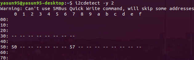 위의 3개의 버스 번호로 주소를 알아낼 수 있다. 다음은 port 0번의 i2c 2번 버스의 주소를 알아내는 명령어이다.