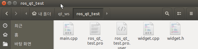 이것들을 전부 끌어와서 아까 만들어줬던 ROS 패키지의 src 디렉터리에 옮겨준다. 소스코드 없이 패키지만 생성했기 때문에 그대로 5개의 파일이 ros_qt_test 패키지에 들어가 있는 상태가 된다.