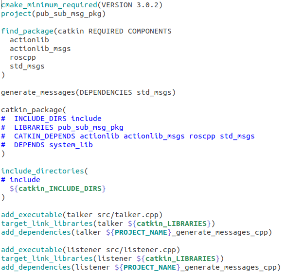 cmake 버전과 패키지 이름, 패키지를 만들때 입력한 의존성(roscpp std_msgs)과 talker 코드, listener 코드의 실행파일 생성을 위한 내용을 CMakeLists.txt에 적어 놓아야한다. [catkin_package의 내용은 주석 처리 되어도 상관없으나 꼭 포함해야지만 에러가 발생하지 않는다.]