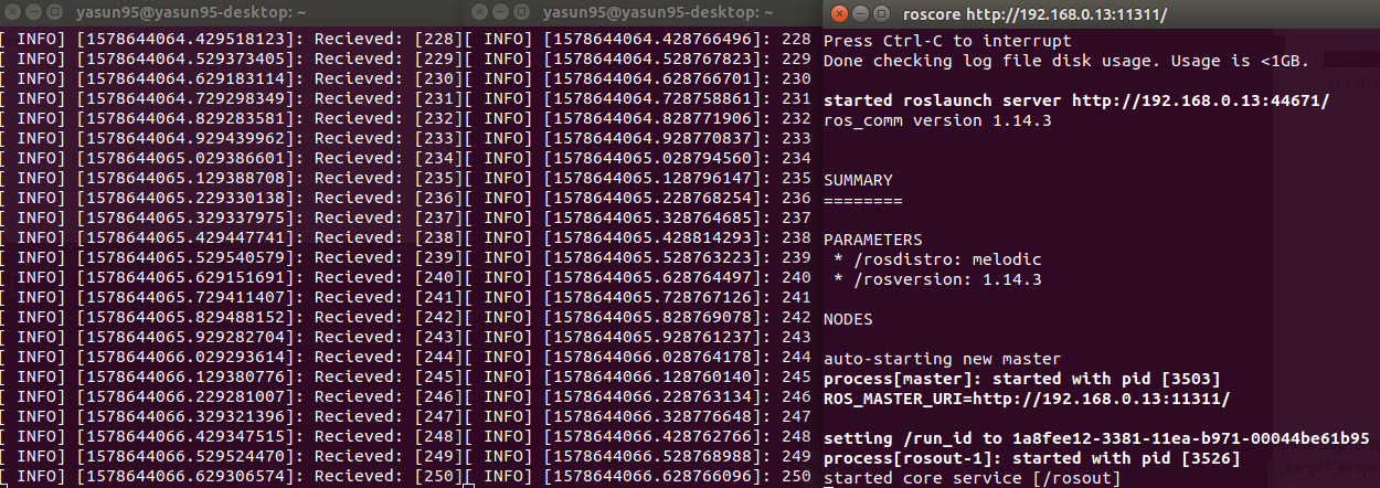 순서대로 listener - talker - roscore 이미지다.