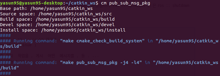 패키지 생성을 마치면 cm(= cd catkin_ws && catkin_make) 명령어로 빈 패키지를 catkin_make 빌드하자.