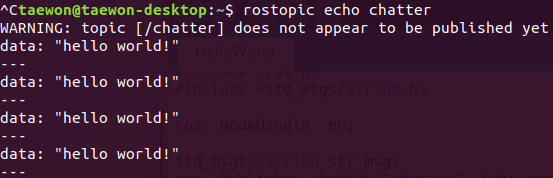 아두이노 예제 맨 아래에 보면 rosserial 예제가 있다... 그중에 hello world 예제를 클릭해 업로드하고 터미널 창을 3개 켠다. 아래의 명령을 모두 입력해주면 hello world가 보일 것이다.