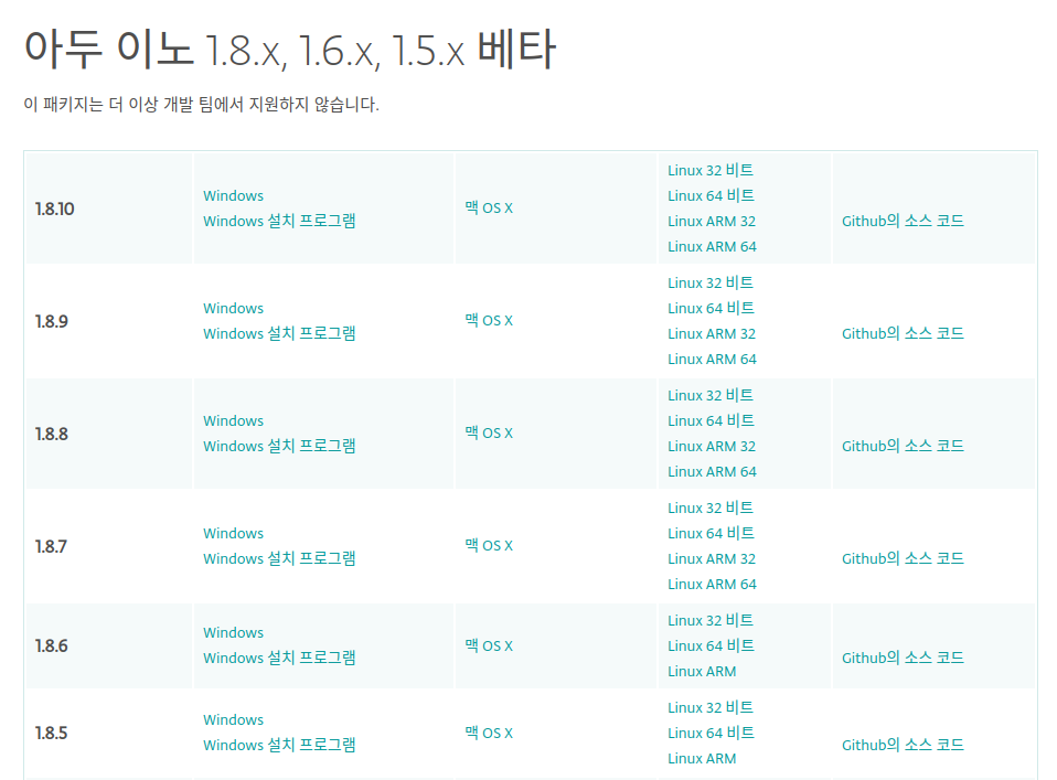 현재 1.8.12 버전이 최신 버전인데 , 최신 버전은 오류가 많을 것 같아 이전 버전을 다운로드하였다. 소프트웨어 다운로드 창 아래쪽을 보면 아래와 같이 이전 버전을 다운로드할 수 있도록 해 놓았다. (나는 1.8.9 버전을 받았음)