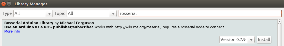 아두이노는 아직 ros.h 가 뭔지 모르니 라이브러리를 설치하기 위해서는 메뉴 창의 Sketch -> Include Library -> Manage Libraries를 클릭해야 한다. 아래와 같이 라이브러리를 검색하는 칸에 rosserial을 검색하고 단 하나 나오는 라이브러리를 다운로드하여주자.