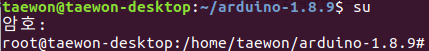 arduino-1.8.5 디렉터리에 들어가서 su 명령어로 관리자 계정(root)으로 전환하고./install.sh을 입력하여 아두이노를 설치한다.