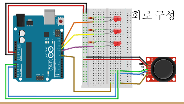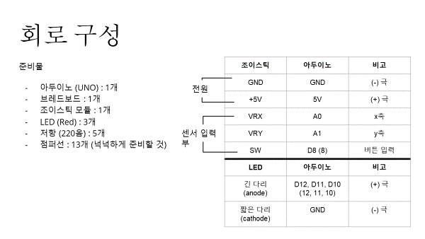 ☞ 준비물 : PC, Arduino UNO R3, 브레드보드, 조이스틱 1개, LED(발광 다이오드) 3개, 버튼 1개, 220Ω 혹은 330Ω 저항 3개