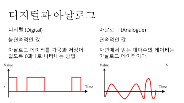 연속적으로 변하는 물리량으로 나타내는 것을 의미한다. 자연에서 얻는 대다수의 데이터는 아날로그 데이터이다. 아날로그 센서인 조도 센서, 거리 감지 센서, 가속도 센서는 값을 연속적인 신호로 뽑아내 전압으로 나타낸다. 아두이노에서는 0에서 1023의 값인 2의 10제곱까지 값으로 나타낼 수 있다.