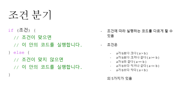 if는 뜻 그대로 '만약에' 를 의미한다. if 문을 이용하면 조건에 맞을 때 실행하거나 실행하지 않도록 제어할 수 있다. 조건이 독립적일 때 많이 사용한다. if - else if - else 문으로도 사용하는데, 조건문을 사용할 때는 조건을 부여하는 순서가 중요하다.