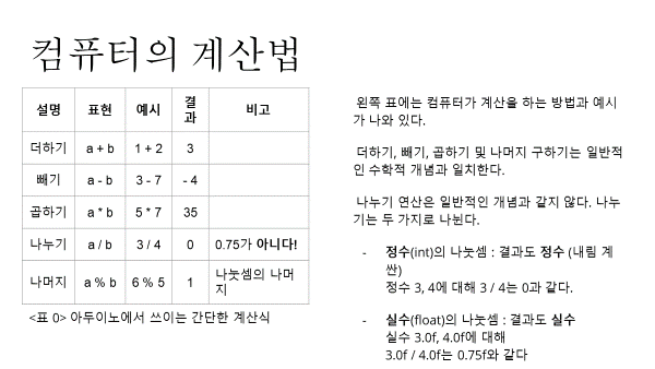 컴퓨터가 하는 사칙연산은 인간이 하는 사칙연산과 조금 다르다. 방식은 아래 PPT에 있는 표와 같으며, 표에 나와있는 예시는 자료형이 정수형(int) 일 때를 나타낸 것이다.