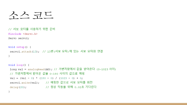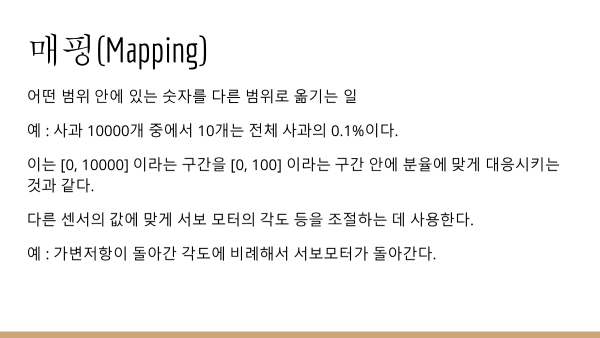 서보모터에 대한 함수를 사용하려면 위와 같이 라이브러리를 불러오는 작업을 해줘야한다. 아래에 나와있는 매핑(Mapping) 설명을 숙지하고, 예제 실습에서는 map 함수를 이용하여 서보모터의 각도 0~180도를 가변저항의 아날로그 값과 일치시켜 사용자가 직관적으로 센서 값을 받아들일 수 있는 코드를 작성해보도록 한다.