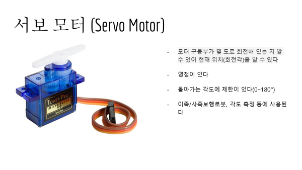 일반 모터에 가변저항을 삽입하여 각도를 조절할 수 있도록 제작한 모터이다. 서보모터마다 다르나 기본적으로 0도에서 180도 사이의 각도로 움직인다. 힘으로 서보모터를 밀면, 최대각이 늘어나서 망가질 수도 있으니 손으로 누르지는 말자. 2 또는 4족 보행 로봇 등에 사용하지만, 힘의 강하지 않으면 버티기 힘들어서 고가의 제품들이 많다.