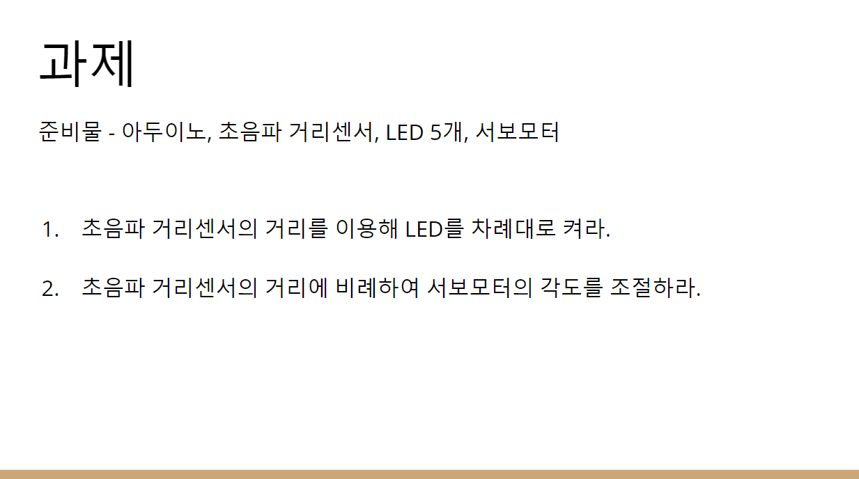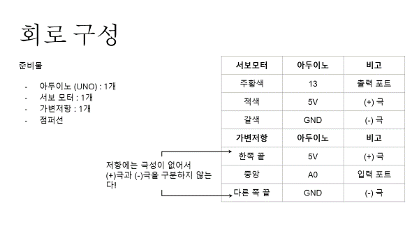 ☞ 준비물 : PC, Arduino UNO R3, 브레드보드, 초음파 센서, RGB LED, 서보모터, 가변저항
