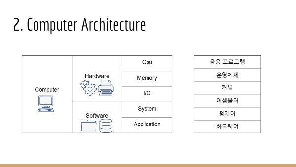 아키텍처는 구조를 의미하고 컴퓨터 아키텍처란 결국 컴퓨터의 구조를 의미한다. 컴퓨터는 하드웨어와 소프트웨어로 나뉘어져있는데 하드웨어에는 중앙처리장치(CPU), 기억 장치(Memory), 입출력 장치(I/O)가 있고, 소프트웨어에는 시스템과 애플리케이션이 있다. PPT의 오른쪽은 컴퓨터의 추상계층으로 하드웨어, 펌웨어, 어셈블러, 커널, 운영체제 및 응용 프로그램 순으로 계층이 존재한다.