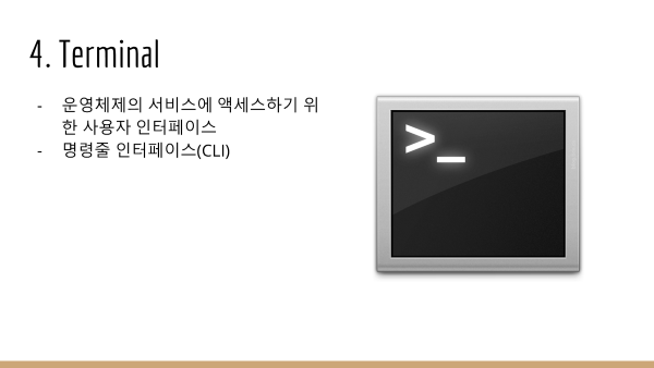 터미널 외에도 마우스를 클릭하여 응용 프로그램을 실행하거나, 인터넷을 사용하거나, 터미널에 명령어를 입력하는 행위처럼 컴퓨터와 핑퐁핑퐁(입력하면 출력하는) 할 수 있는 것들이라고 생각하면 된다.