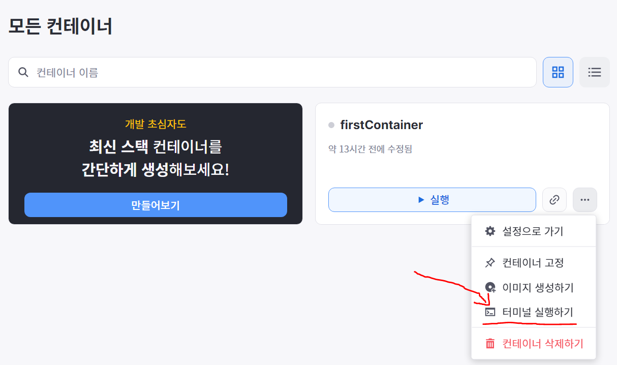 터미널을 생성하고나면 오른쪽 ...에 터미널 실행하기 버튼으로 터미널에 진입할 수 있다. 아래에 나와있는 터미널 명령어를 하나씩 입력하면서 어떤 명령을 수행하는지 하나씩 확인해보자.