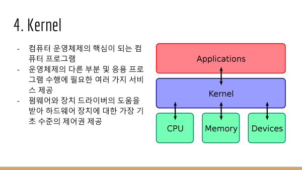 ◎ 커널은 운영체제의 핵심이 되는 컴퓨터 프로그램으로 하드웨어인 중앙처리장치, 기억 장치, 입출력 장치를 통제한다.