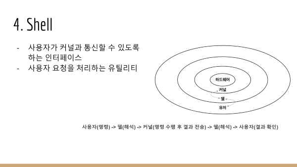 이와 같이 어려운 구조로 이루어진 시스템을 사용자가 쉽게 사용할 수 있도록 중간에서 중계자 역할을 해주는 것이 있는데 이를 셸(Shell)이라고 한다. 대표적으로 터미널을 셸의 일종이라 할 수 있는데 이는 사용자가 익히기만 하면 사용할 수 있는 영어 명령어를 통해 하드웨어 시스템을 제어할 수 있도록 커널에 전달하는 인터페이스 역할을 하기 때문이다.