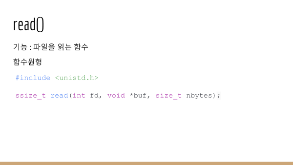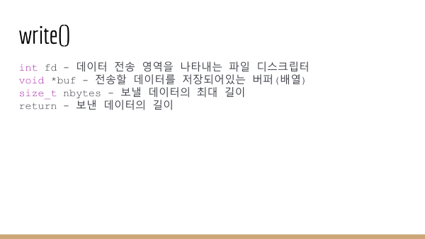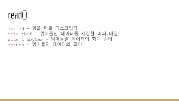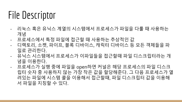우리나라식으로는 파일 서술자또는 파일 기술자라 표현하고, 앞서 배운 read, write 과 같은 함수의 첫 번째 인자이다(FD : File Descriptor). 파일 디스크립터는 프로세스가 실행되고있는 파일에 시스템 콜을 이용하여 접근할 때 참고하는데, POSIX(Portable Operating System Interface X : IEEE가 제정한 유닉스의 API 규격)에 의하면 이를 0이 아닌 양의 정수형(unsigned int)으로 받으며 결론적으로 프로세스에서 열린 파일을 관리하기 위한 인덱스 값을 의미한다.