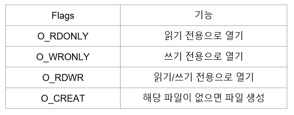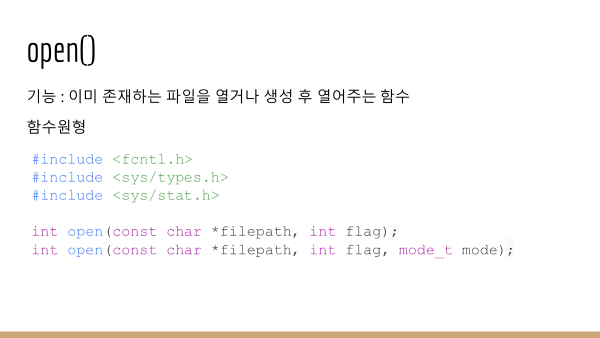 open() 함수는 파일을 열거나 생성할 때 사용하는 함수이다. file control의 줄임말인 fcntl.h 헤더 파일을 통해 사용할 수 있다. 정수형으로 함수를 선언하며 인자로는 filepath, flag, mode 세 가지가 있다.