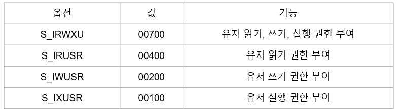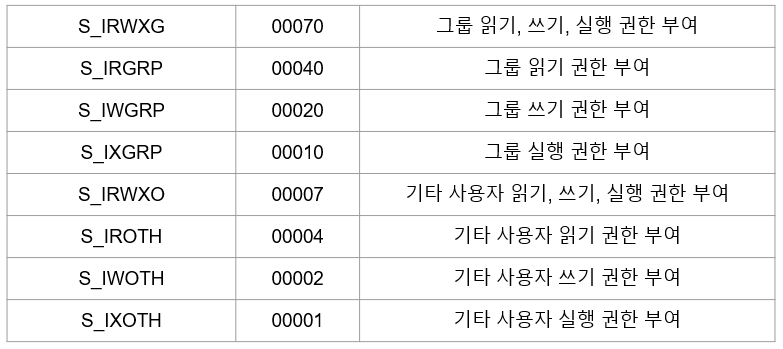 앞서 open()에서 설명한 바와 같이 파일에는 접근 권한이 있는데 open() 함수에서는 읽기, 쓰기, 실행 권한만 정할 수 있었고 creat() 함수에서는 사용자 별로 권한을 줄 수 있어 mode 인자에 총 12개 옵션이 있다. 숫자로는 위와 같이 chmod를 통해 권한을 부여할 수 있으며 문자로 권한을 부여하는 방법에 대해서 얘기해보려 한다.