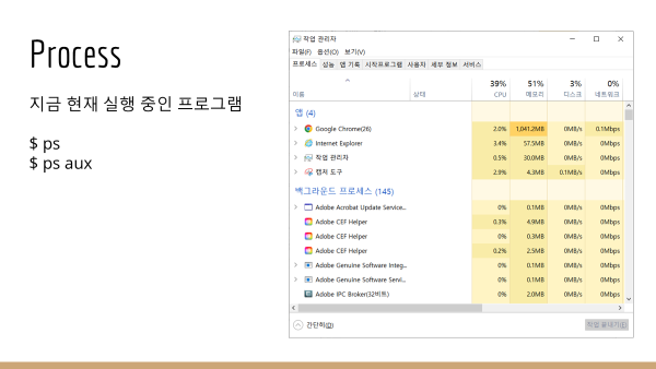 프로세스란 컴퓨터에서 연속적으로 실행되는 프로그램을 의미한다. 윈도우 운영체제에서 작업 관리자의 프로세스 탭에서 내 컴퓨터에서 실행되고있는 프로그램을 확인할 수 있다.