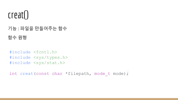 파일을 만들어주는 함수이다. 인자는 filepath, mode 두 가지를 받아 생성할 파일의 경로와 해당 파일에 접근 권한을 부여할 수 있다. 접근 권한은 네자리 수로 부여할 수 있으며, 기본값이 있어 파일의 경우 0666, 디렉터리의 경우 0777으로 mode 인자에 아무 것도 입력하지 않고 함수를 호출하는 경우에 기본값을 적용하여 파일을 생성할 수 있다.