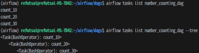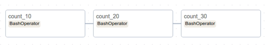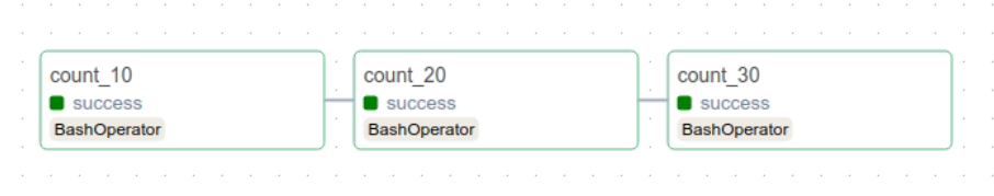 이는 작업간 의존성을 설정한다. 작업은 count_10, count_20, count_30 순으로 앞선 작업이 성공적으로 완료되고 다음 작업이 실행하는 구조이다. 만약, 이전 작업이 실패했을 경우 다음 작업은 진행되지 않는다.