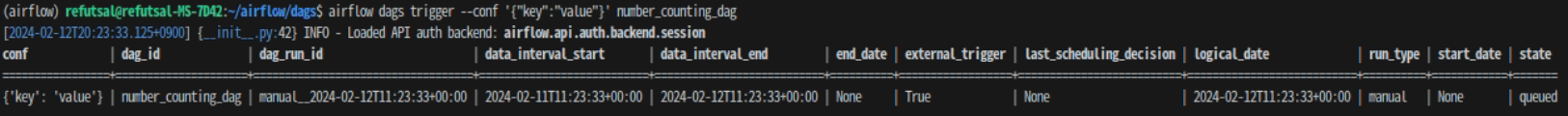 airflow dags trigger --conf '{"key":"value"}' number_counting_dag
