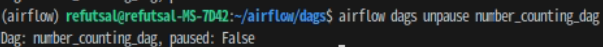만약 웹 서버 UI가 아닌 터미널을 통해 DAG를 활성화하려면 아래와 같이 터미널에 입력해주자.