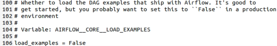 # 터미널에서 편집기 명령과 함께 Airflow의 환경설정 파일을 열어 load_examples = False로 변경하자