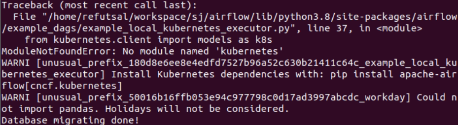 airflow db migrate를 입력한 경우에는 Databases migrating done! 이라는 문구가 나오지만 몇 경고들이 쏟아져 나오는데.....이런 것들은 초기에 해결해야하는게 좋다...