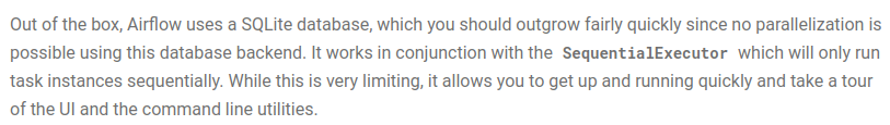 또한 Airflow는 SQLite가 아닌 Postgres나 MySQL 사용을 추천하고 있다. docs를 살펴보면 다음과 같은 문구가 있다.