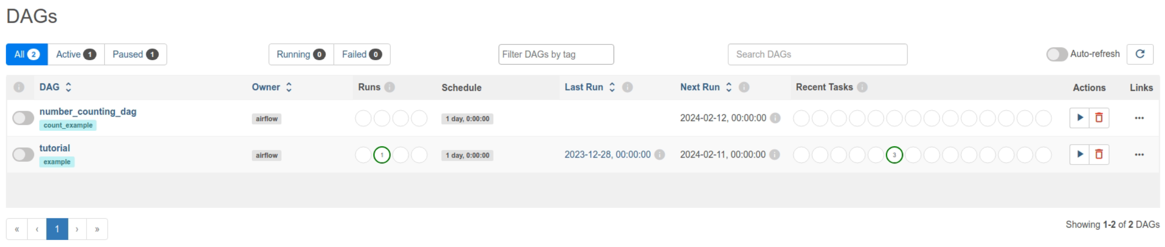 그러면 이전에는 tutorial 밖에 없던 웹 서버 UI에 "number_counting_dag"라는 이름의 DAG가 생긴 것을 확인할 수 있다.
