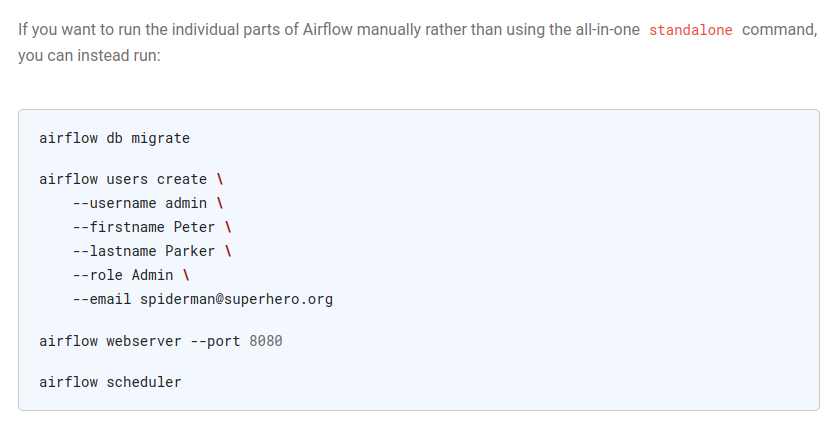 개별적으로 airflow의 기능을 실행할 경우 한 번에 전부를 실행해버리는 standalone 명령어를 사용하지말고 위와 같이 입력하여 사용하라고 한다. 무튼 시키는 대로 DB 사용자를 추가해주자. 그리고 나서는 사용자 정보를 바탕으로 실행하면 된다.