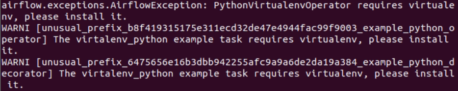 다행히도 간단한 해결책이 있다. 상단의 내용은 Airflow에서 제공하는 virtualenv_python 예제에는 virtualenv 모듈이 필요하다고 설치를 하라고 한다. 저 예제를 해볼지는 모르겠지만 일단 경고문이 나왔으니 설치해주는게 좋다.