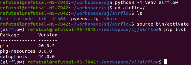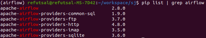 의존성 패키지 설치와 경로 설정을 완료하면 pip를 통해 airflow를 설치한다. 설치가 완료되면 pip list | grep airflow 명령어로 다음과 같은 내용을 얻을 수 있다.(airflow 부분만 디스플레이가 일그러져 화가 잔뜩 났다)