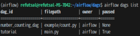 그리고 나서 터미널에 dag 리스트 출력 명령어를 입력해보면 다음과 같다.