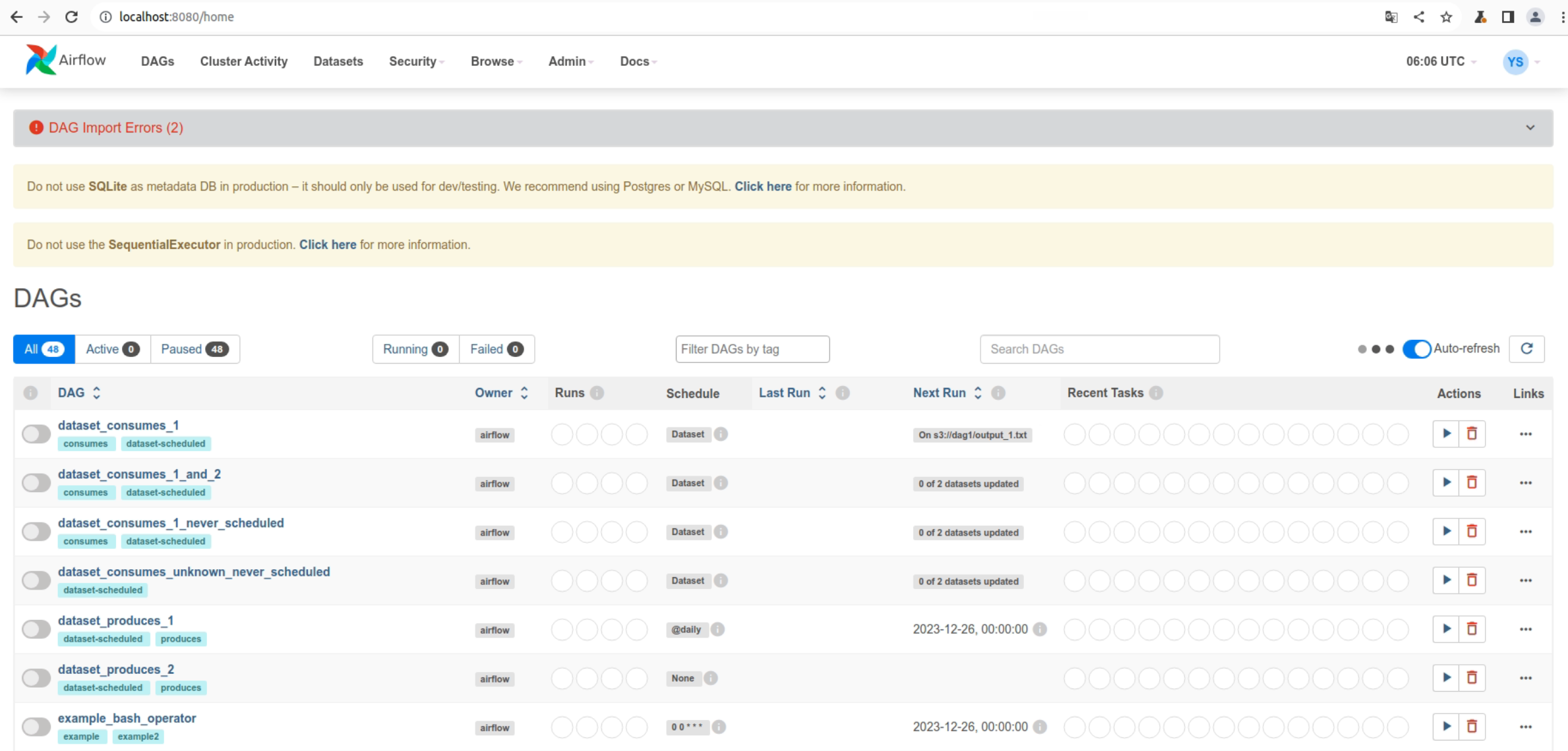 웹 서버를 실행하면 http://localhost:8080에서 airflow UI를 사용할 수 있게됩니다.